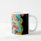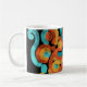 A fun and unique coffee mug that won't look like everyone else's! An abstract design of orange, gold and bright blue on a black background. The design is on all sides. Stand out in the office!