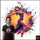Background/Style: The figure is centered against a large, glowing orange/yellow circular shape, which acts as a vibrant background for an explosion of multi-colored paint splatters (pink, blue, yellow, orange). The aesthetic is modern, neon, and high-energy.
