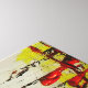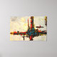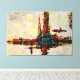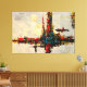 A vibrant cityscape is portrayed with bold, abstract strokes in red, blue, and yellow against a muted gray background. Two large, glowing moons add a surreal, otherworldly atmosphere to the scene.