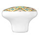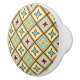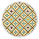 Abstract geometric pattern with diamond shapes in pastel colors. Each contains a star-like motif in teal, orange, or brown. Retro and symmetrical design.
