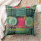 A bold grunge pattern throw pillow featuring a layered collage of geometric shapes, stenciled circles, rough squares, crosshatch grids, and fragmented text over a distressed, paint-splattered background. The design blends teal/petrol green, magenta/hot pink, and yellow with black and white accents, creating an acid-wash, street-art vibe. It has gritty textures, hand-drawn elements, and retro-urban aesthetic.