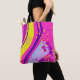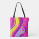 The swirling pink, yellow, and purple abstract pattern creates an energetic, modern look that transforms a simple tote into a playful statement accessory.