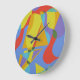 This abstract clock features a central triangle surrounded by vivid bursts of color reminiscent of Mardi Gras festivities. The strong geometric center contrasts with lively, playful background shapes, creating a dynamic and contemporary design that instantly brings joy to any room.