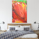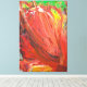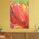 Rich reds dominate the surface, balanced by warm earth tones and flashes of green, creating depth and visual tension.