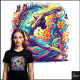 Color Palette: Dominated by high-saturation, warm and cool neon colors: yellow, orange, cyan, magenta, and purple.