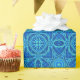 Presentpapper i ett geometriskt, akvarelleffekt-mandalamönster i nyanser av ljust till mörkt denimblått
