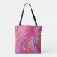 Den här väskan skryter med ett ljust och färglöst mönster som verkar vara sjunga! Den har en abstrakt, en konstnärlig snurra mönster i skuggor av rosa, orange och blått. Fet och vacker! Båda sidor av påsen har samma bild.