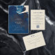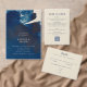 Gratulera till kärlek med den moderna abstraktens blåa marininbjudan till bröllop spara datum, en contemporary för ett badbröllop, nautiskt bröllop eller kustnära bröllop. Denna stationär biet i bröllop är en unik och modern tolkning av romantik som ligger i havet och utlovar ett oförglömligt firande vid kusten. Anpassa den med den bild du väljer på baksidan.