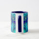 Blått kombinationstecken i abstrakt i mugg har fractal konst i vibrerande färg (blått, cyan, grönt och lila).
