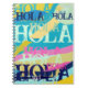 Hola-text upprepad i en färgfull palett med blått, gult, rosa, turkos och grönt.