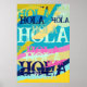 Hola-text upprepad i en färgfull palett med blått, gult, rosa, turkos och grönt.