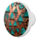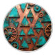 En nödsituation i kopparpatina som visar en blandning av turkos, bränd orange och jorda bruna nyanser, försedd med trianglar och runda växlar i olika storlekar.