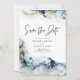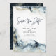 Denna moderna falska guldglitter och marin akvarell splash spara datum kortsdesign är perfekt för paret som vill införliva stämningsfull, elegant fin bröllopslook!