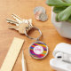 Personligens runda nyckelkedjor har abstrakt, en färgstark regnbåggradient i ljusa gulter, orange, rött, lila, blått och grönt skuggor samt anpassade namn och monogram i rosa på ett vitt runt ram.