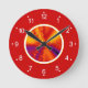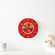 Den här rundväggsklockan har vita siffror och en abstrakt eldstadskonst i gyllene gult, orange, rött och lila mot röd bakgrund.
