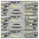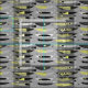 Skraj tyg för utrymmeålderovaler med trianglar. Färger av gult, vit och svarten på en grå färg, texturerad lookbakgrund. Mitt--århundrade inspirerad tygdesign. Alla diagram av Gail Gabel, LLC.