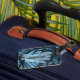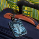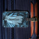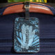 Personlig bagageetikett med abstrakt fjärilskonst i levande blå nyanser.