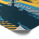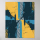 En modern abstrakt som blandar fet gult, blått och mörk med grymge-stil penseldrag och strimlat mönster. De korsande formerna och struktur skapar en känsla av råenergi, rörlighet och industriell estetik i städerna.