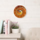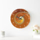 Den här rundklockan har en vacker spiral-formad fyrkantsövertoning i orange- och guld-skuggor med vita siffror.