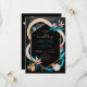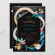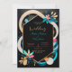 Den här bilden har en levande och modern abstrakt design som passar för en bröllopsinbjudan eller liknande evenemang. Konstruktionen centreras kring ett svart sexkantigt ram med en guld-kontur som ställs in mot mörkens bakgrund. Området kring ram är djärva, blommande former i färg som teal, rosa, beige och mörk blått, som ger en dynamisk och livlig beröring åt sammansättningen. Användan av inslag i den geometriska blommigten i kontrasterande färg förstärker den visuella dragningskraften, skapar att denna utformning känns ny och contemporary. Arrangemanga på färg och former skapar en känsla av balans och harmoni, medan det hexagonala ram tillhandahåller en strukturerad kontaktpunkt för all text eller information som kan läggas till. På det hela taget framstår den här utformningen som en modern elegans och en lekfull sofistikering, och skapar den perfekt för ett bröllop som omfattar ett färgstarkt tema för contemporary. Anpassa texten om namn och detaljer om bröllop. Du kan ladda ned kortet till din mobila enhet eller dator.