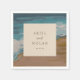 Moderna napkins i bröllop med namn och bröllop-datum över en abstrakt kustbakgrund.