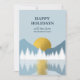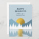 En vacker design som visar en skog täckt av snö, bergslandskap och en gyllene solnedgång eller soluppgång som speglas i vattnet. Färgtoner inkluderar neutrala toner som blå, vit och guld. En rustik design som är idealisk för vinterdekor och den festliga högtiden.