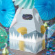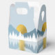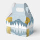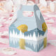 En vacker design som visar en skog täckt av snö, bergslandskap och en gyllene solnedgång eller soluppgång som reflekteras i vattnet. Färgtonerna inkluderar neutrala toner som blå, vit och guld. En rustik design som är idealisk för vinterheminredning och den festliga högtiden.
