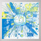 Ett viskigt sol i en klok och rörig abstrakt ord art stil färgad blå och gult.