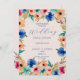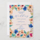 Det här bröllop-kortet har en mjuk, romantisk design med ett vattenfärgstema för blommigt. Kortets gräns är försedd med delikata blommor av pastelltyp i blå, rosa, persika och grönt, som skapar en levande än elegant gräns. Texten är centrerad i ett klassiskt serif-teckensnitt, där "Bröllop" är markerat i ett elegant-skript, vilket ger en något sofistikerad bild. Den totala estetiska kombinationen av en modern, ren layout med den tidlösa charmen av handmålad blommigt konst, skapar den perfekt för ett romantiskt och formellt uttalande från bröllop. Anpassa texten om namn och detaljer om bröllop. Ytterligare information om bröllop kan läggas till på baksidan. Du kan ladda ned kortet till din mobila enhet eller dator. Berätta om du behöver hjälp med att fylla i avsnittet om anpassning. Utformningen har gjorts med hjälp av hjälpmedel från luftfartsteknik.
