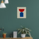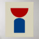 En modernt konsminimalistisk abstrakt av röda och blå geometriska former på en beige bakgrund.