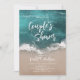 Den romska kustens temade duschinbjudan till par har en vacker moody abstrakt vattenfärgad gnistrande havsvåg och strandbakgrund, överdragen med snyggt och information om typsnittshändelser för elegant, modern och enkel, underbar för sandstrasbröllop, tropiskt destinationsbröllop, kusthav, temed bröllop. Visa alla matchande delar i samlingen.