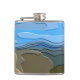 En ljus, färgstark abstrakt utformning av ett bergsperspektiv, med blå himmel, sten och träd.