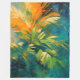 Detta uttrycksfulla abstrakta konstverk fångar den livfulla andan hos tropiska palmer genom djärva, fragmenterade penseldrag och dynamiska färgkontraster. Lager av frodig grönska och djup teal bildar en rik, texturerad bakgrund, medan skurar av gyllene gult och varmt orange strålar genom palmbladen och skapar en känsla av solljus som bryter genom tät lövverk. Kompositionen känns levande och energisk, som om palmen svajar i en varm kustbris.