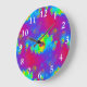 Den här stora rundklockan har spiral fraktalteckningar i regnbåge färg och vita siffror.