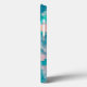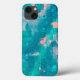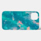 Den ursprungliga abstrakta konstverket av ZoeSPEAK på denna iPhone 13-fodral gjordes från Zoes ursprungliga fotografi av regndroppar på ett blad i trädgården. Designens färger är tropiska akvablåa och persikorosa.