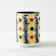 Abstrakt Scribble Polka Dot Mönster Two-Tone Coffee Mugg designad av Nisha Prabhu CuteHomeGifts. Färgfull abstrakt mönster med svart lodrät rand klottecken och svart röd färg polka punkt på gultens bakgrund.