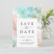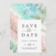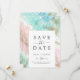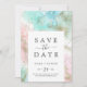 Spara datum meddelande-kortet i abstrakt är perfekt för ett modernt bröllop. Den unika eleganten har ljusblå, mynta grönt, rosa och lila av pastellfärg med stänk i guld glitter, vilket skapar en skönhetskänsla.