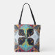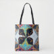 Den här väskan har en svart blomma på komplex, multifärgad, kaleidoskopisk bakgrund.