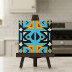 Dekorativt geometriskt mönster med geometriska former i turkos, gult, svart och vitt.