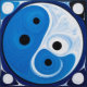 En modern bild av yin yang i färg av blått och vitt mot en bakgrund av sovande cirkelformade geometriska former, som symboliserar balansen mellan olika energiformer i contemporaryns liv.