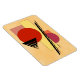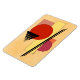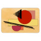 En svart triangel indelad i segment, ett svart trapezoidalt band indelat i två, en röd cirkel, en rektangel med gult, en röd kvadrat med blek, en lila cirkel och en fyrkantig orange i denna abstrakt av överlappande former av Richard H. Fay.