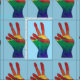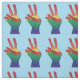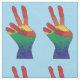Abstrakt av en hand i regnbågens färg, ge ett fredstecken, vinklas på anpassningsbarna. Bakgrunden färg i himmel blå kan anpassas.