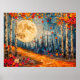 Abstrakt vattenfärgsillustration av en guldhöstskog under ett glödande fullt måne. Vibrant löv i orangens nyans och rött kontrasterar med den blåa natten himmel.