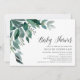 Chic-babyduschinbjudningar innehåller grönt-eucalyptus-löv som illustreras i vattenfärg. Anpassa till babyduschdetaljer som är anpassade till högerna. Kort återgår till solid grönt av skog.