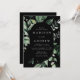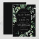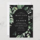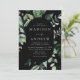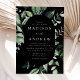 Inbjudningar i elegant bröllop som innehåller uppgifter om bröllop som förvaras i ett ovalt ram, omgivet av eukalyptus, ferns och annan rik greenery med svart bakgrund. De moderna botaniska bröllopsinbjudningarna går tillbaka till en solid svart bakgrund. Designad att samordna med vår samling i Abundant Greenery bröllop.