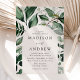 Inbjudningar i elegant bröllop som innehåller dina bröllop-uppgifter som är kapslade i ett bågat ram omgivet av eukalyptus, ferns och annan rik greenery med krämbakgrund. Bröllopet på botaniska bågar går tillbaka till en solid mörk grönt bakgrund. Designad att samordna med vår samling i Abundant Greenery bröllop.
