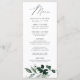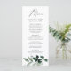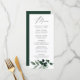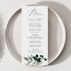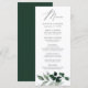 Menyn elegant bröllop med "Menu" som visas i ett modernt kalligrafiskt skript med en bukett av eukalyptus, fern och annan rik greenery som visas nedan. Anpassa menyn för botaniskt bröllop med namn, datum för bröllop och middagsmenyn. Den enkla menyn bröllop går tillbaka till en solid mörk grönt bakgrund med utrymme för foton och ytterligare text. Designad att samordna med vår samling i Abundant Greenery bröllop.
