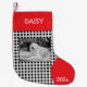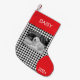 Trendy pet Christmas stocking featuring your pet photo, black and white buffalo check background, red top and toe and white name across the top. The back is a solid red. Dimension: 9" x 16". Easily change the name, edit or remove the year on the toe, and add your own photo using the Template provided. Excellent print and quality materials. See "About This Product" for more information. Made in the USA.