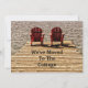 Adirondack-strandstolar har flytta kort. Rustic land brunburgundi, röd, modern, chic, trendig, unik. Personlig pension stil design. Ordet "Vi har flyttat till stugan". Anpassa din typografi efter teckensnitt storlekt, stil, färg eller ta bort om du vill. Upphovsrätt Marg Seregelyi Fotography.