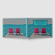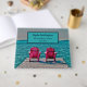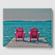 Denna design för gästbok till pensionsfesten består av två Adirondack-strandstolar på en träbrygga. Scen från stugans sjöhus, trendig, chic, modern, rustik, teal, turkos rosa. Bild copyright Marg Seregelyi Photography.
